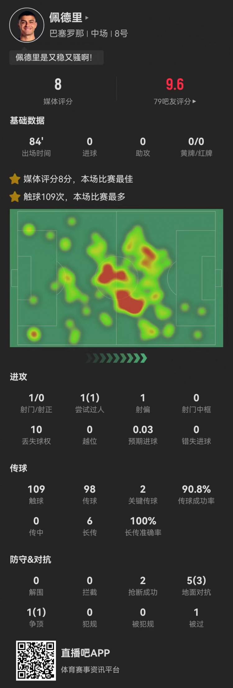 3月28日訊 巴薩在本輪西甲3-0擊敗奧薩蘇納,佩德里在賽后被官方評為全場最佳球員。他本場數據如下:首發出戰84分鐘預期助攻0.72109觸球98傳球、89成功,成功率91%2關鍵傳球6長傳、6成功1創造重大機會1過人、1成功6對抗、4成功10丟失球權2搶斷1被過獲評8.0分 本文標簽: 足球 西甲 巴塞羅那 奧薩蘇納