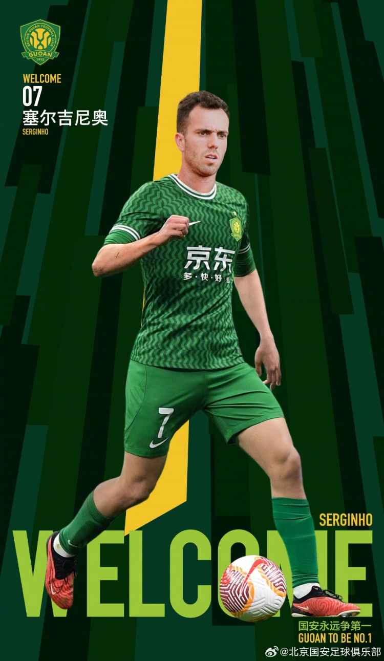 塞爾吉尼奧(Sérgio Ant?nio Soler de Oliveira Junior)正式加盟北京國安足球俱樂部,他將身披7號球衣,代表北京國安出戰本賽季中超聯賽、亞冠聯賽、足協杯等各項賽事。