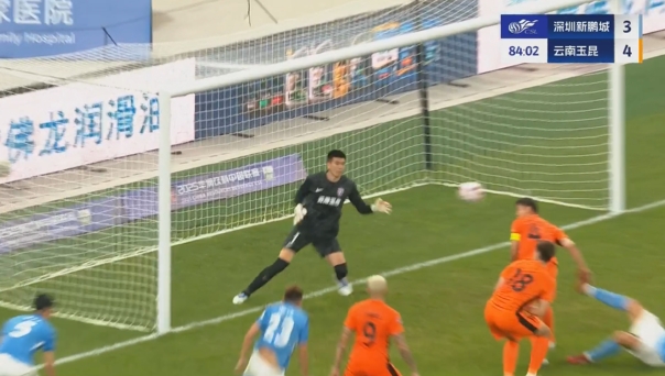 03月28日訊 中超第3輪,深圳新鵬城vs云南玉昆,比賽第84分鐘,楊一鳴頭球砸中李松益入網,深圳新鵬城扳回一球3-4落后云南玉昆。