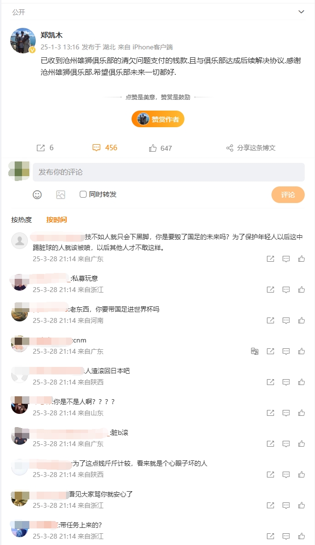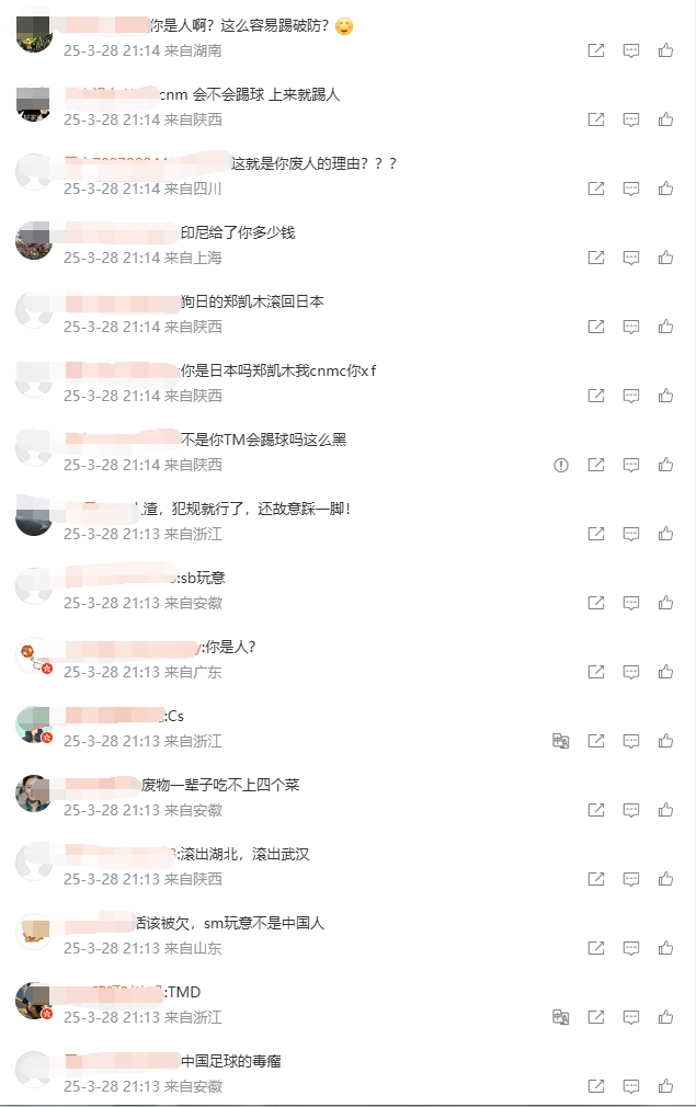 03月28日訊 在本輪中超武漢三鎮vs浙江的比賽中,王鈺棟第47分鐘遭遇鄭凱木身后犯規,痛苦倒地并且被擔架抬下場。不少球迷第一時間沖入鄭凱木的個人微博進行聲討,他最新的一條動態在短時間內被刷了數百條評論,大多都是在責罵鄭凱木對王鈺棟的犯規。 本文標簽: 足球 國家隊 中國男足 中國足球 中超 浙江 武漢三鎮