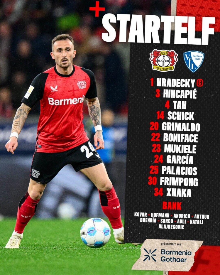勒沃庫森首發:1-赫拉德茨基、23-穆基勒、4-塔、3-因卡皮耶、30-弗林蓬、34-扎卡、25-帕拉西奧斯、24-阿萊克斯、20-格里馬爾多、22-博尼法斯、14-希克