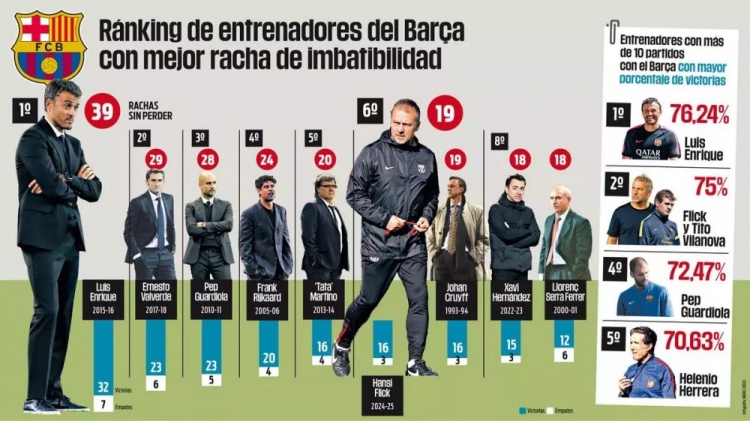 3月29日訊 巴薩在西甲補賽3-0完勝奧薩蘇納,延續了弗里克帶隊的出色表現,《每體》統計顯示弗里克是巴薩隊史主帥連續不敗榜第6,并且總勝率僅次于恩里克。