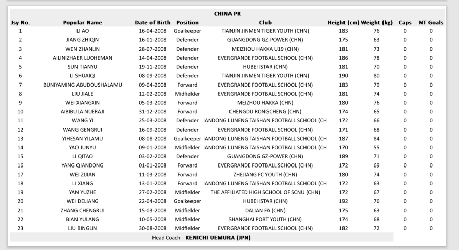 03月29日訊 亞足聯官方公布U17亞洲杯各隊23人名單,中國隊名單中艾比布拉領銜,魏祥鑫、布尼亞明在列。這支U17國足由上村健一掛帥,近期在迪拜集訓期間,球隊共打了4場熱身賽,均失利。