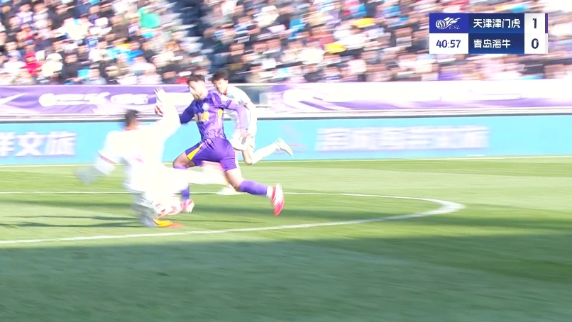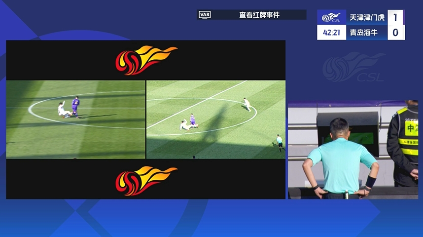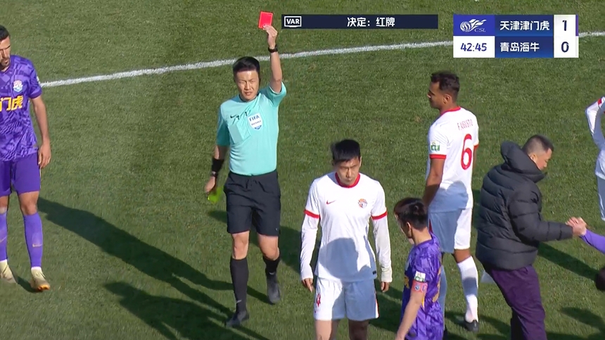 03月29日訊 中超第三輪,津門虎vs海牛。第42分鐘,海牛后衛金洋洋飛鏟哈達斯,主裁起初出示黃牌,VAR介入后主裁改判紅牌將其罰下!