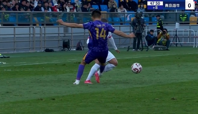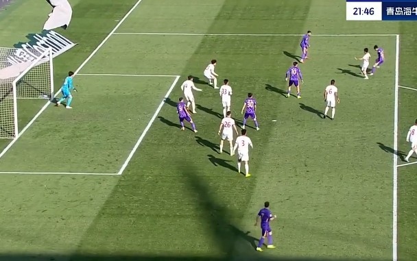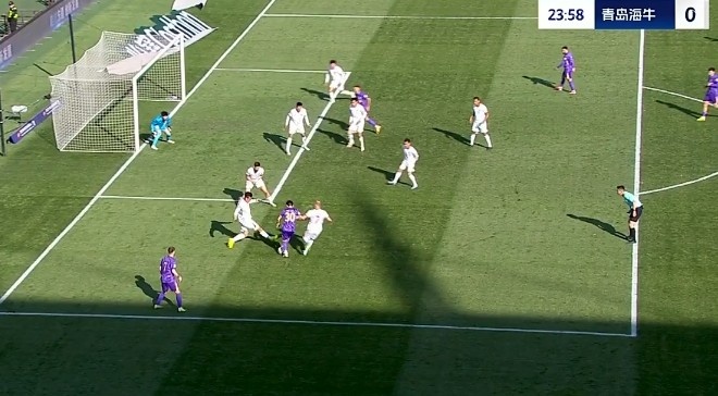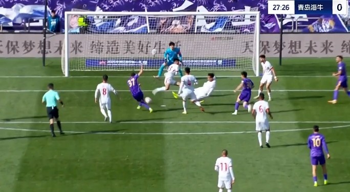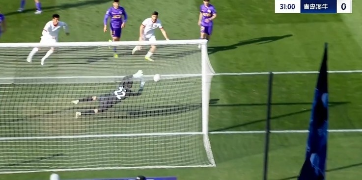 第31分鐘,青島海牛禁區里一次頭球攻門被門將飛身撲出底線。↓