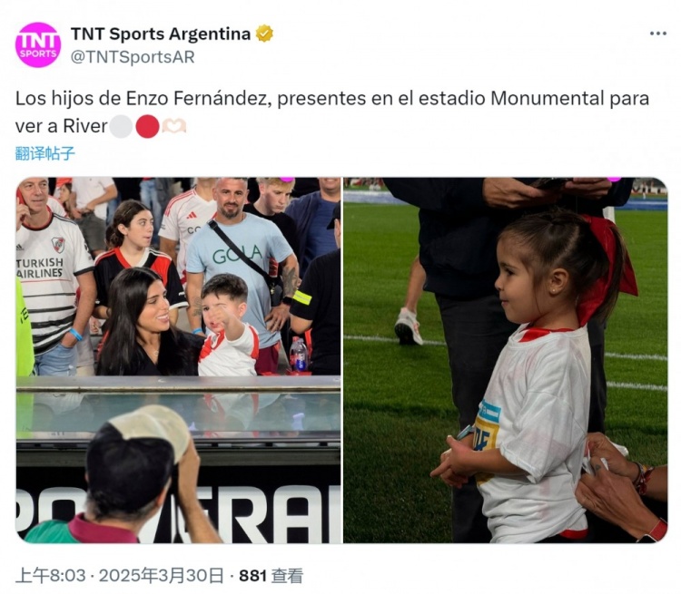 3月30日訊 河床對陣羅薩里奧中央的比賽正在進(jìn)行中,恩佐-費(fèi)爾南德斯的女友瓦倫蒂娜現(xiàn)場觀看比賽。瓦倫蒂娜帶著孩子們來到紀(jì)念碑球場,現(xiàn)場觀看河床隊的比賽。恩佐出身于河床青訓(xùn),他與瓦倫蒂娜去年曾分手,兩人今年1月份宣布復(fù)合。 本文標(biāo)簽: 足球 英超 切爾西 阿超