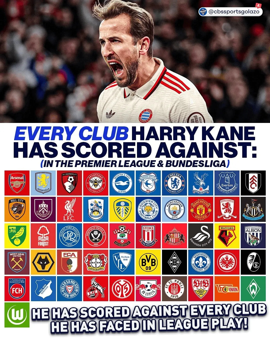 據媒體數據統計,此役過后,凱恩生涯在德甲、英超面對過51家俱樂部,而且全場完成破門得分!
