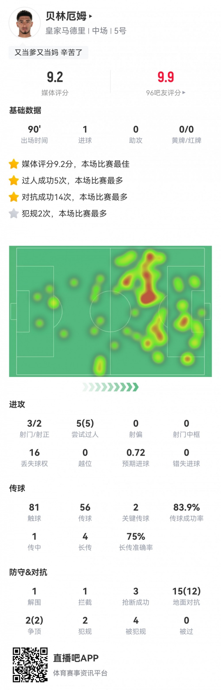 3月30日訊 本輪西甲,皇馬3-2萊加內斯。此役貝林厄姆首發打滿全場,球員全場重點數據如下↓3射2正1粒進球5次過人全部成功16次丟失球權預期進球0.7281次觸球傳球成功率83.9%2次關鍵傳球4次長傳成功3次17次對抗成功14次3次搶斷1次解圍1次攔截4次被犯規評分全場最高9.2 本文標簽: 足球 西甲 皇家馬德里 貝林厄姆