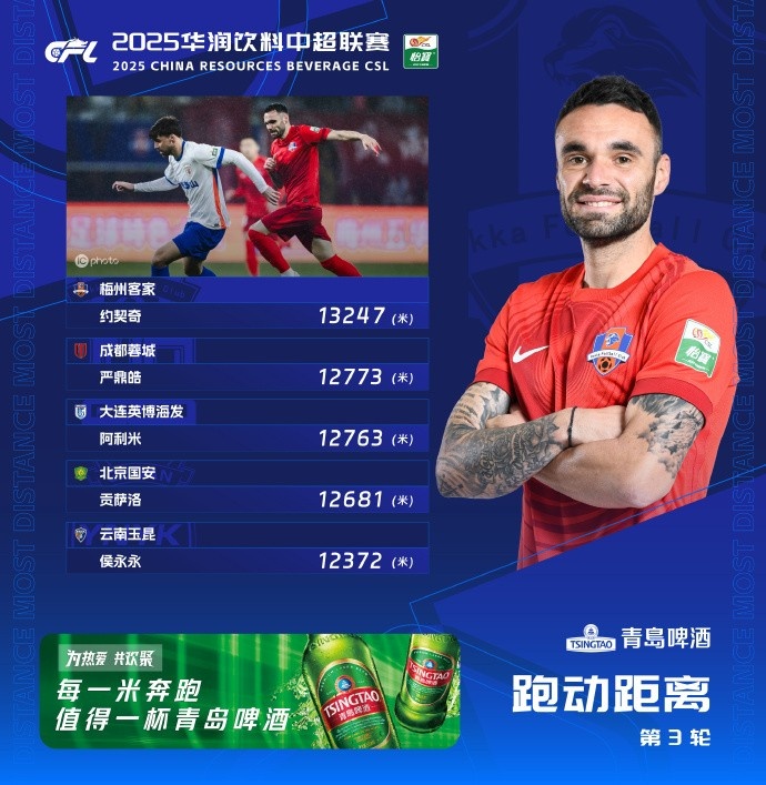 3月30日訊 中超第3輪已經結束爭奪,中超官方統計了第3輪跑動距離榜,梅州客家球員約契奇登頂。附中超第3輪跑動距離榜:1、約契奇(梅州客家)13247米2、嚴鼎皓(成都蓉城)12773米3、阿利米(大連英博)12763米4、貢薩洛(北京國安)12681米5、侯永永(云南玉昆)12372米 本文標簽: 足球 中超 中國足球 成都蓉城 北京國安 大連英博 云南玉昆 梅州客家