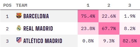 本輪西甲,馬競客場1-1戰(zhàn)平西班牙人,賽后多賽距離榜首已有6分之差。數(shù)據(jù)機(jī)構(gòu)Opta給出的最新數(shù)據(jù)顯示,馬競本賽季西甲奪冠概率只剩下0.8%,基本可以宣布退出爭冠。