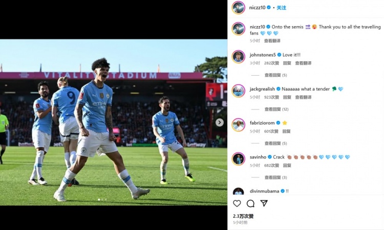 奧賴利也在賽后通過社媒曬出自己的慶祝照并配文:“晉級半決賽????????感謝所有的遠征球迷????????????”。包括斯通斯和格拉利什在內的多位隊友也現身評論區鼓勵:“愛了愛了”、“多棒的自我展示!”…
