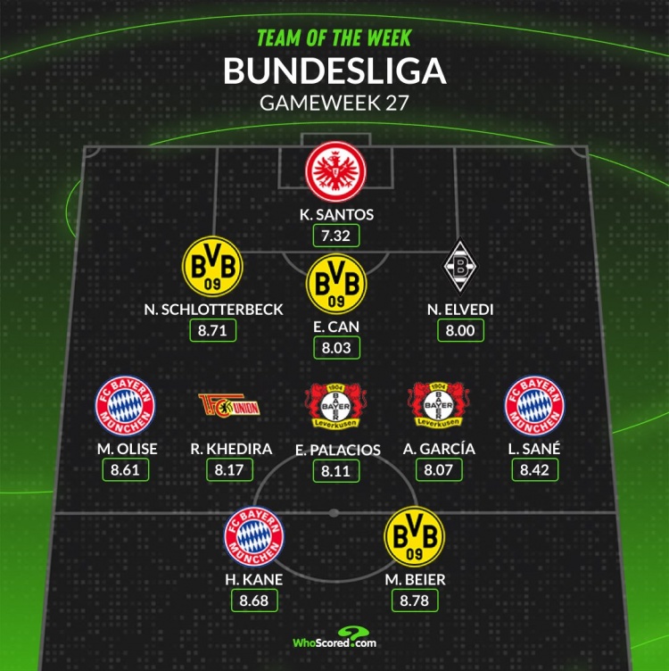 WhoScored德甲第27輪最佳陣容: