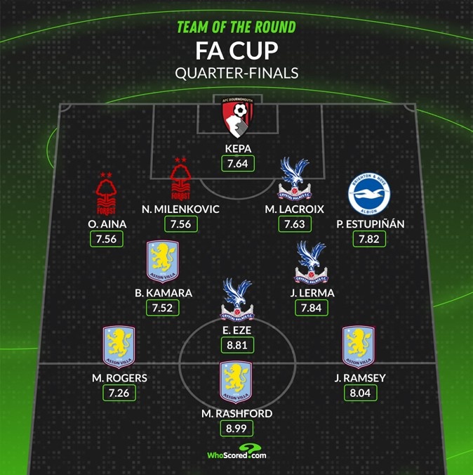 3月31日訊 足總杯八強戰已經完賽,whoscored也列出了本輪評分最佳陣容,維拉4將在列。