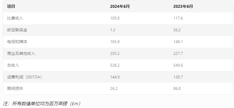 -比賽日收入1.058億英鎊(2023年:1.176億英鎊),主要由于本年度主場比賽場次比去年減少9場