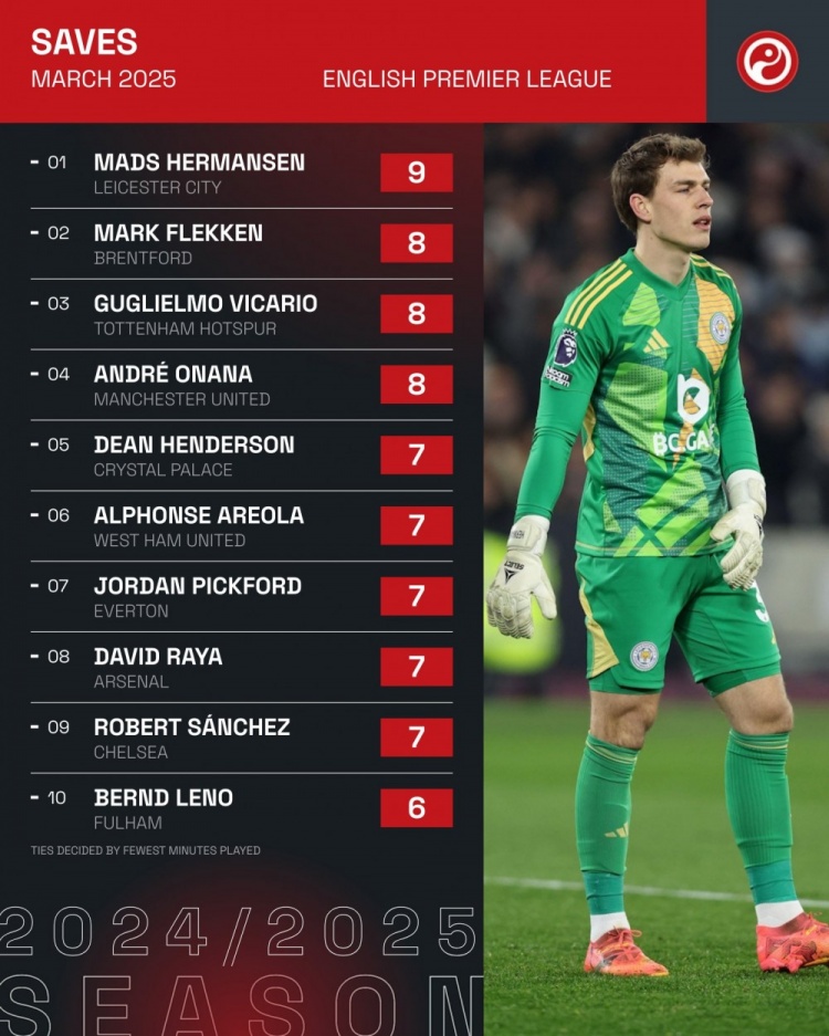 4月1日訊 Squawka統計了3月份英超門將的撲救次數,并列出榜單,赫爾曼森9次居首,弗萊肯、維卡里奧、奧納納8次并列第二。