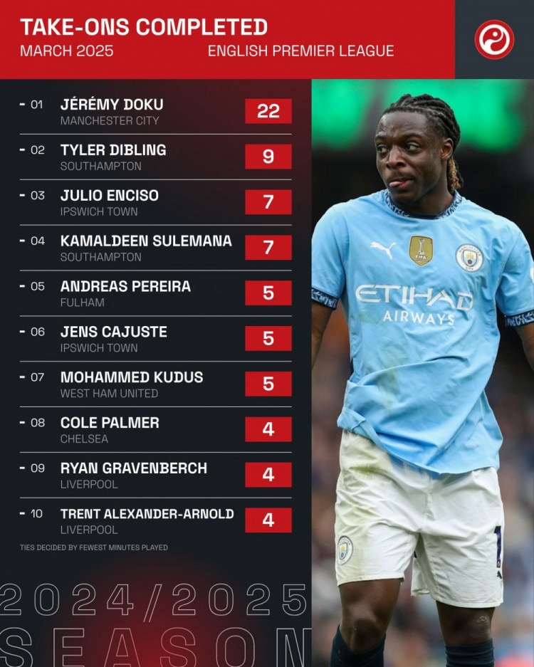 4月1日訊 Squawka統計了英超3月份球員的成功過人數據,并列出榜單,曼城邊鋒多庫22次斷層居首,迪布林9次第二。值得一提的是,多庫的過人次數在英超球隊中也能排在第三位,僅次于曼城和南安普頓。