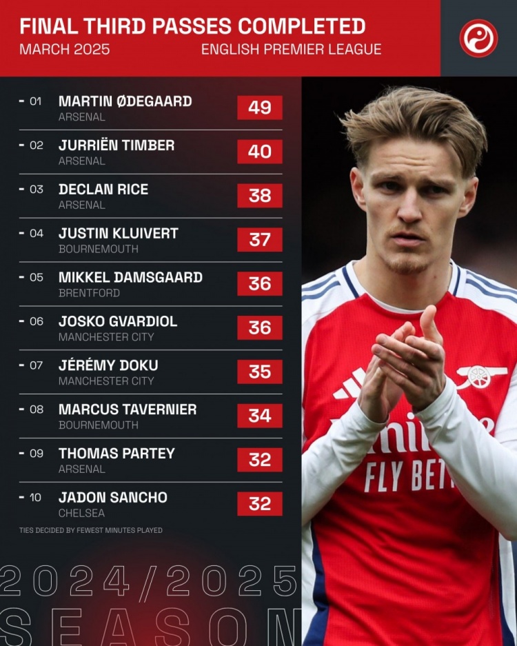 4月1日訊 Squawka統計了球員在3月份英超比賽中的進攻三區成功傳球次數,并列出榜單,阿森納包攬前三名。英超3月份進攻三區成功傳球排名:厄德高(阿森納)——49廷伯(阿森納)——40賴斯(阿森納)——38小克魯伊維特(伯恩茅斯)——37達姆斯高(布倫特福德)——36格瓦迪奧爾(曼城)——36多庫(曼城)——35塔弗尼埃(伯恩茅斯)——34托馬斯(阿森納)——32桑喬(切爾西)——32 本文標簽: 足球 英超 阿森納 切爾西 曼城 伯恩茅斯 布倫特福德