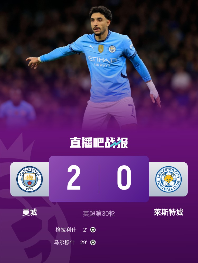 格拉利什閃擊破門,馬爾穆什擴大領先優勢,曼城2-0擊敗萊斯特城。