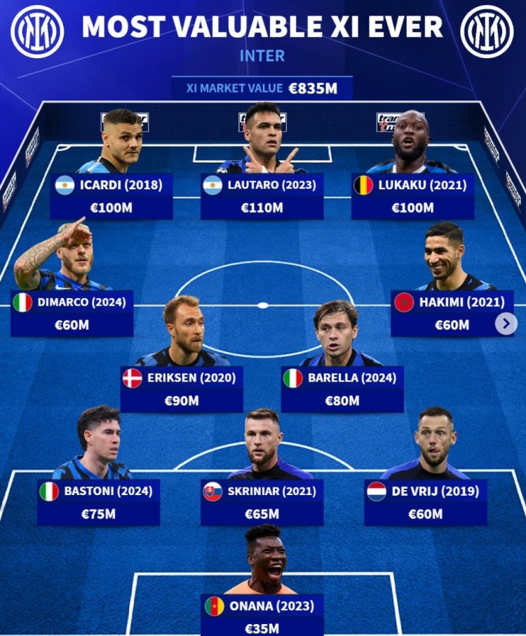 國米歷史最貴陣:總身價(jià)8.35億歐元