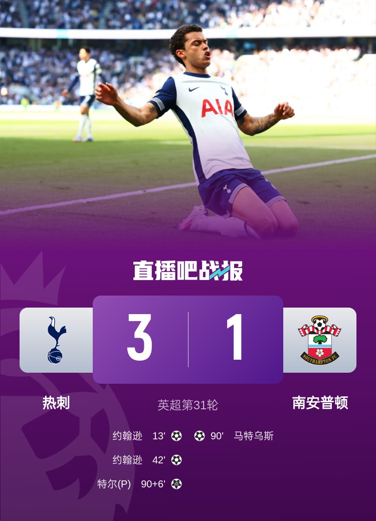 熱刺本輪3-1擊敗南安普頓,圣徒在聯(lián)賽剩余7輪的情況下提前降級,也創(chuàng)下了聯(lián)賽紀(jì)錄。