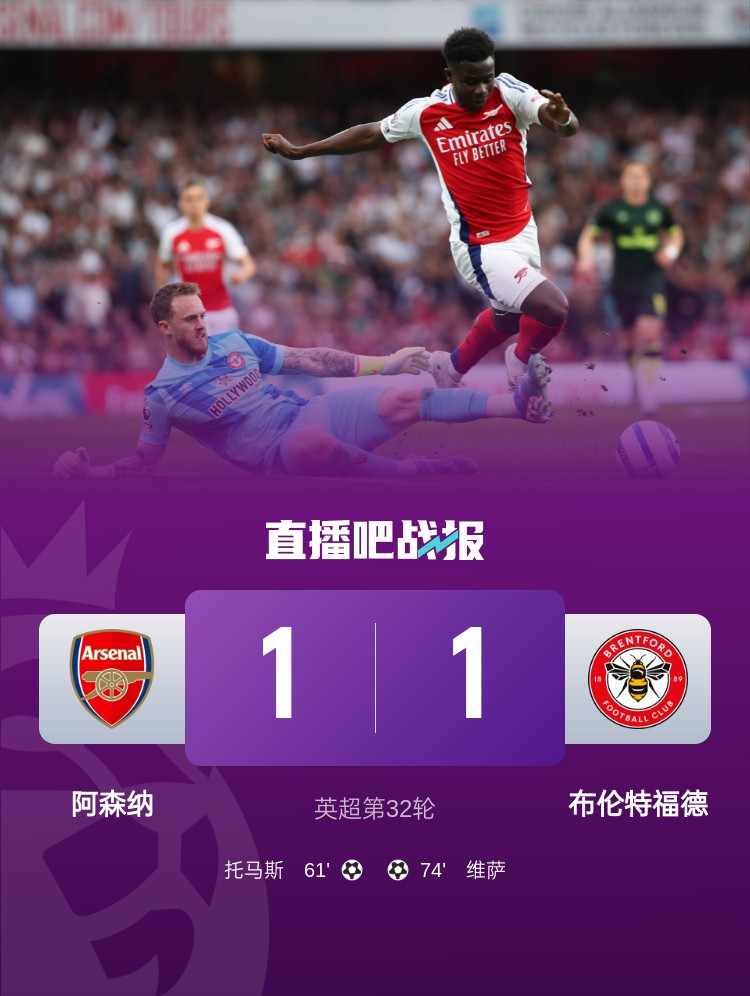 英超第32輪,阿森納1-1布倫特福德,托馬斯進球,賴斯助攻。