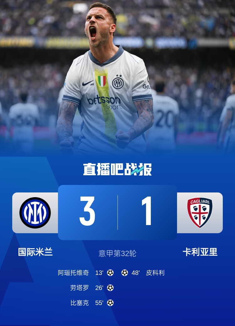 意甲第32輪,國米3-1卡利亞里,阿瑙托維奇傳射,勞塔羅進球。