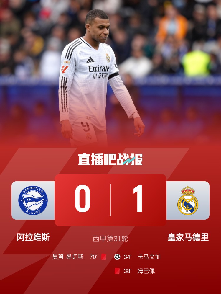 卡馬文加世界波迎聯賽首球,姆巴佩兇狠蹬踏對手小腿被直紅罰下,最終十人皇馬客場1-0戰勝十人阿拉維斯。