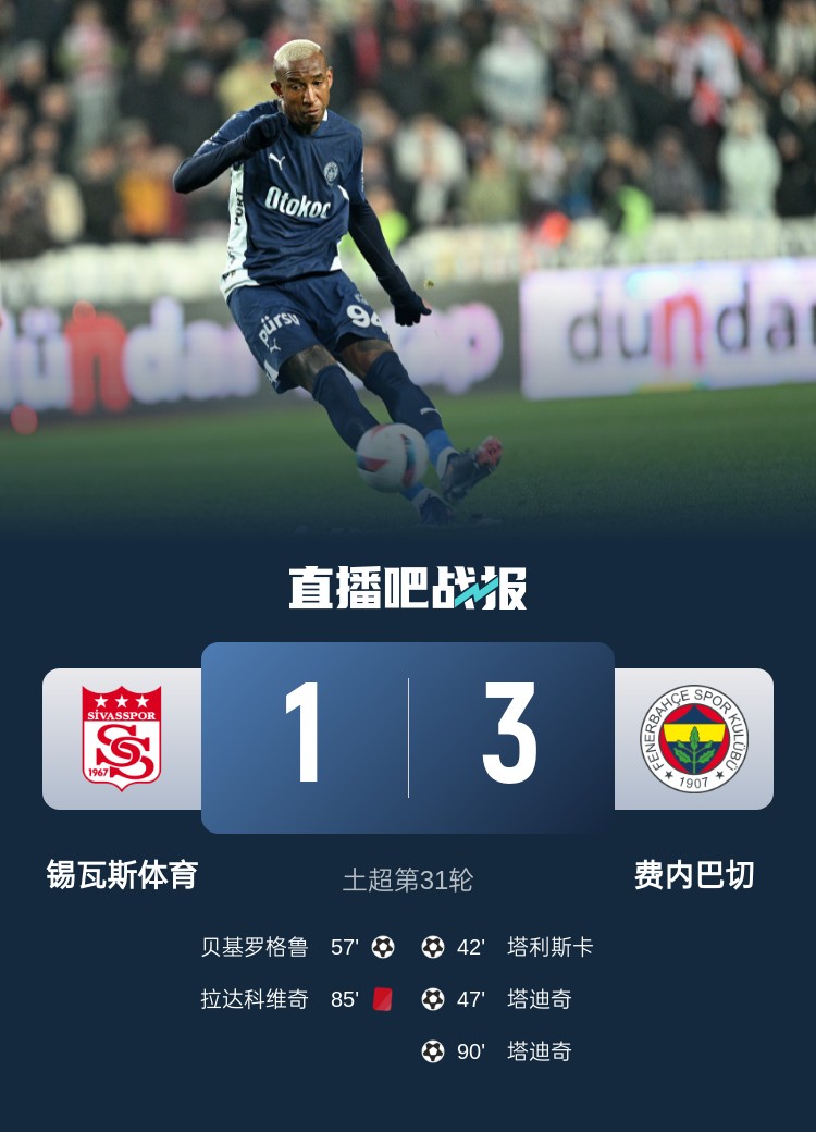 塔迪奇梅開二度,費內巴切3-1錫瓦斯體育。