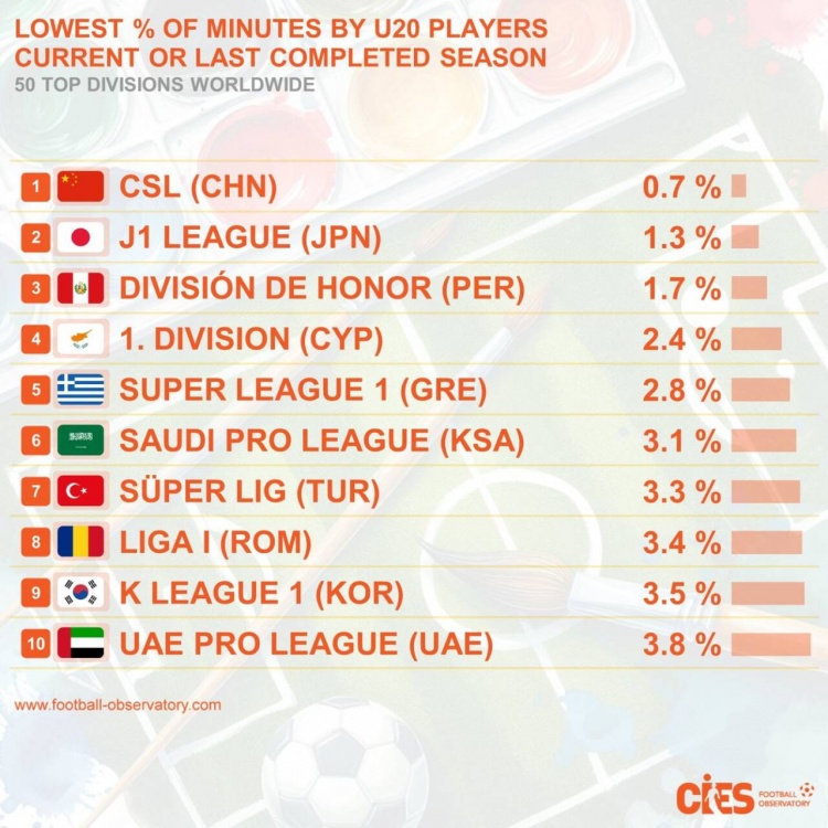CIES統(tǒng)計數(shù)據(jù)基于當(dāng)前賽季(非跨年賽事如中超則為2024賽季)出生于2004年以后的球員在所有比賽出場時間百分比。中超以0.7%排在“第一”,日本J聯(lián)賽、秘魯聯(lián)賽緊隨其后,沙特、韓國等聯(lián)賽同樣榜上有名。