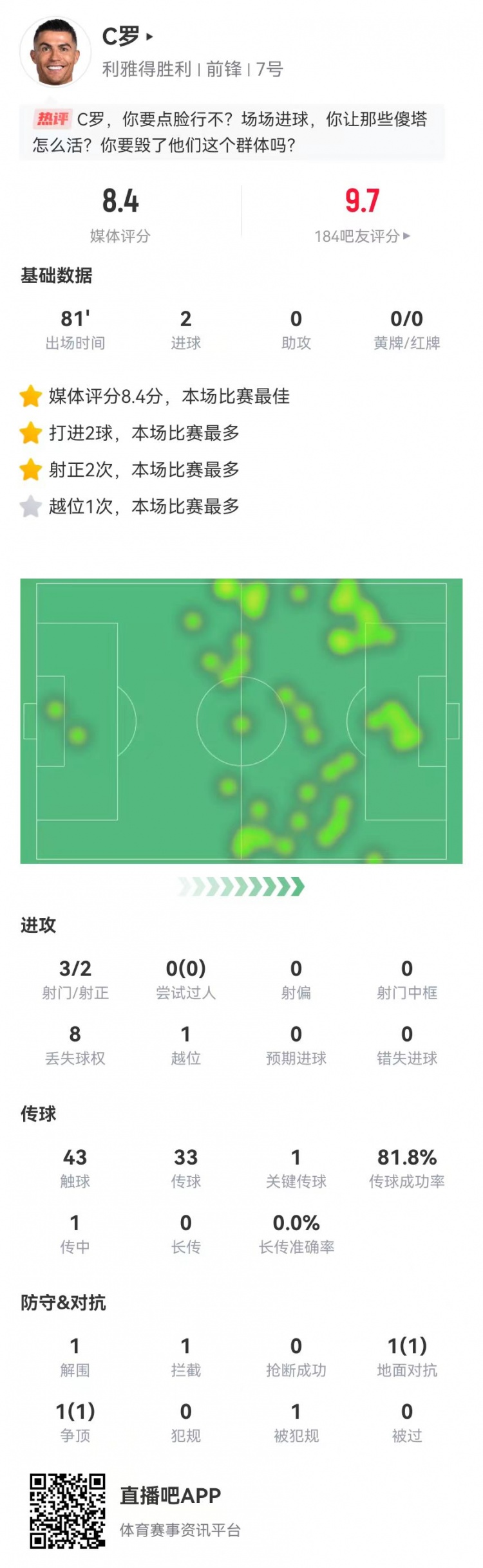 2月4日訊 利雅得勝利在本輪亞冠4-0迪拜祈禱,C羅本場(chǎng)數(shù)據(jù)如下: