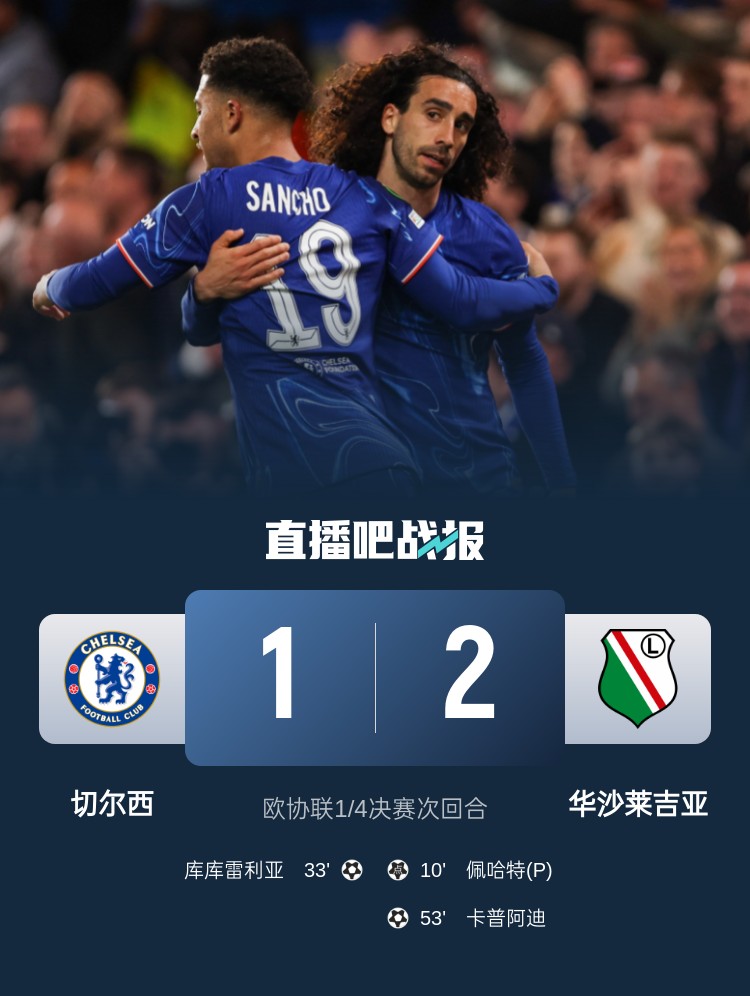 切爾西1-2不敵華沙萊吉亞,以兩回合總比分4-2淘汰對手,晉級歐協(xié)聯(lián)四強。
