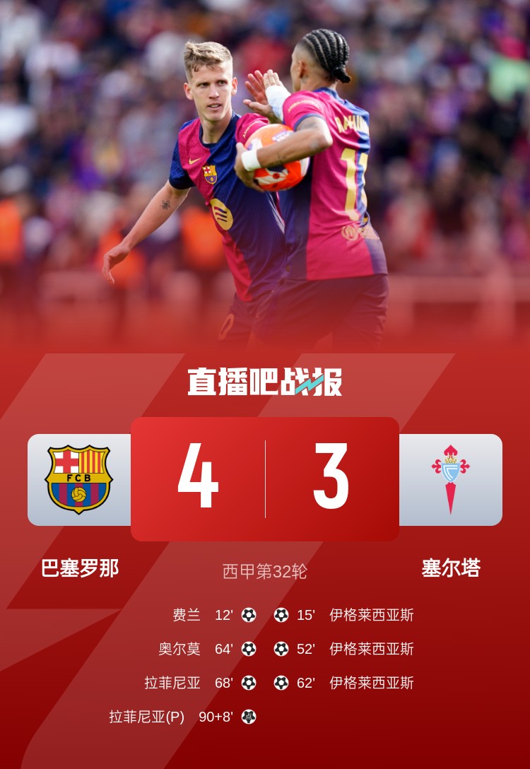 04月20日訊 西甲第32輪,巴薩主場(chǎng)4-3擊敗塞爾塔上演大逆轉(zhuǎn),本輪先賽領(lǐng)先皇馬7分。