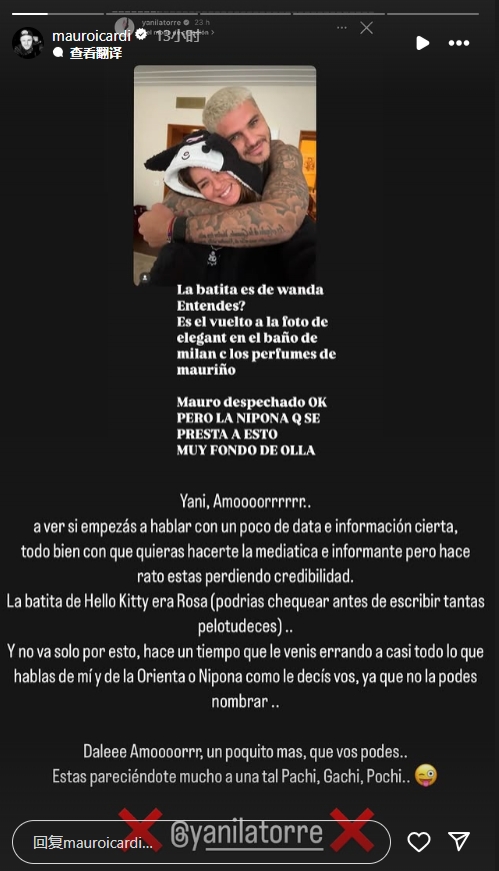 伊卡爾迪寫道:雅尼(下圖右邊為伊卡爾迪說的 Yanina Latorre),你想成為一名媒體人、消息人士,這很好,但用事實和證據說話。你正在失去信譽,Hello Kitty的睡衣是粉色的,寫這么多之前你能檢查下嗎?