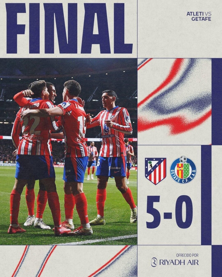 西班牙國(guó)王杯八強(qiáng)戰(zhàn),馬競(jìng)5-0赫塔菲晉級(jí)四強(qiáng)。上半場(chǎng),小西蒙尼雙響,阿爾瓦雷斯助攻利諾破門(mén)+失單刀;下半場(chǎng),小西蒙尼破門(mén)無(wú)效,科雷亞傳射建功,索爾洛特推射破門(mén)。