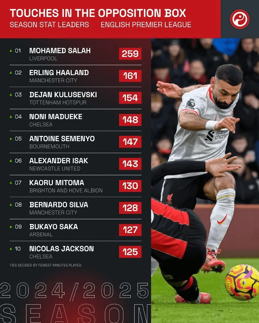 2月5日訊 Squawka統(tǒng)計(jì)了本賽季英超球員在對(duì)方禁區(qū)內(nèi)觸球情況,薩拉赫斷崖領(lǐng)跑。