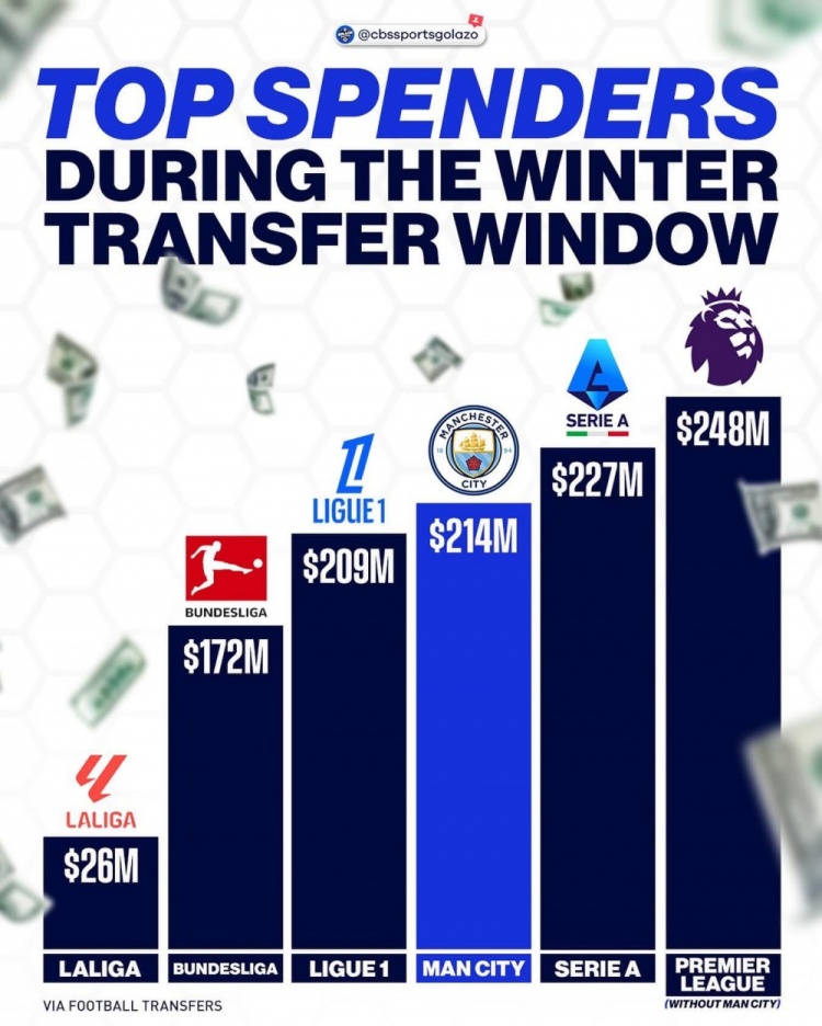 破費2.18億歐元簽入5名球員,超過西甲、德甲和法甲整個聯賽的花費,僅支付的溢價便超過1億歐元,過去的這個冬窗是屬于曼城的獨角戲,瓜迪奧拉已經做好了圍繞哈蘭德進行全面重建的準備。