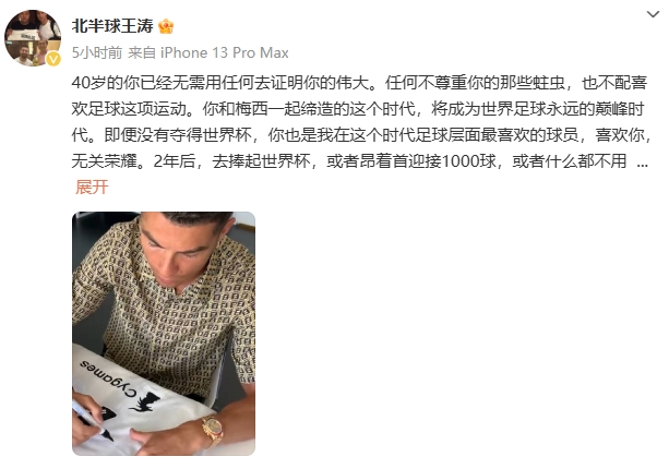 C羅迎來40歲生日,王濤在微博曬出C羅簽名照,并寫下一段話祝福C羅。