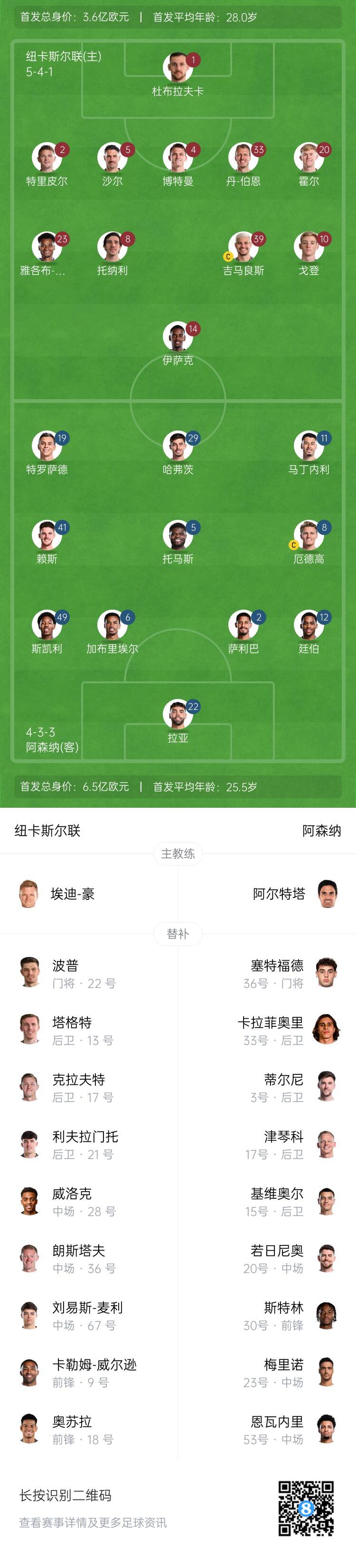 紐卡首發:1-杜布拉夫卡、2-特里皮爾、4-博特曼、5-沙爾、33-丹-伯恩、39-吉馬良斯、8-托納利、20-霍爾、23-墨菲、14-伊薩克、10-戈登