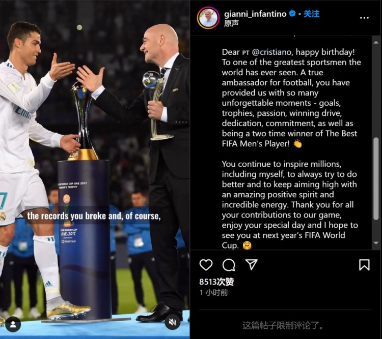 因凡蒂諾寫道:親愛的C羅,生日快樂!向世界上最偉大的運(yùn)動員之一致敬。作為真正的足球大使,你為我們提供了如此多令人難忘的時刻——進(jìn)球、獎杯、激情、獲勝的動力、奉獻(xiàn)、承諾,以及兩次當(dāng)選FIFA最佳球員!????
