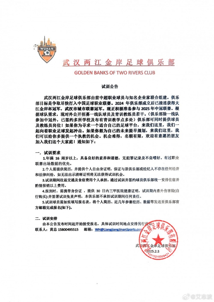 2月6日訊 近日,武漢兩江金岸足球俱樂部官方發布試訓公告。武漢兩江金岸足球俱樂部由艾志波、李行、小黃博文等前武漢隊球員組建,俱樂部的目標是爭取盡快打入中國足球職業聯賽。2024年,俱樂部成立后已接連獲得大江金岸杯冠軍,武漢市城市聯賽冠軍,現正積極準備參與2025年中冠聯賽。根據球隊需求,現對外公開招募一線隊球員及青訓教練員若干,試訓球員有過職業聯賽出場數據的優先。 本文標簽: 足球 中超 中國足球
