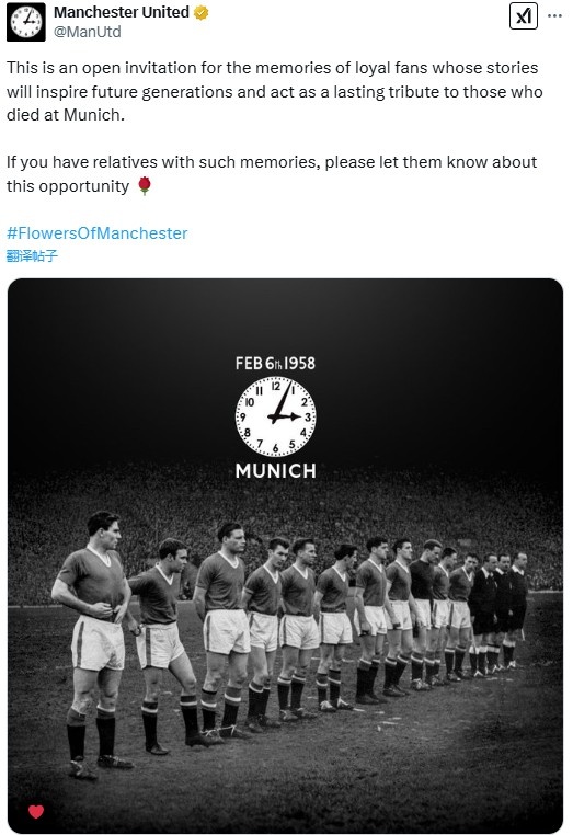 2月6日訊 曼聯(lián)官推發(fā)文悼念慕尼黑空難,并更改頭像。