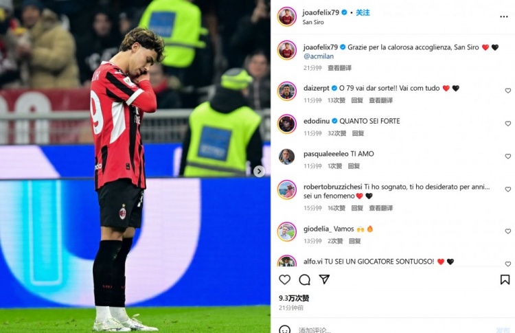 2月6日訊 米蘭在本輪意大利杯3-1擊敗羅馬,菲利克斯首秀替補建功。第71分鐘,米蘭兩位冬窗新援替補連線,希門尼斯直塞,菲利克斯單刀破門。他也在賽后通過社媒曬出自己進球后的慶祝照,并配文:“謝謝你們的熱烈歡迎,圣西羅??????@AC米蘭俱樂部”。 本文標簽: 足球 意甲 AC米蘭 羅馬