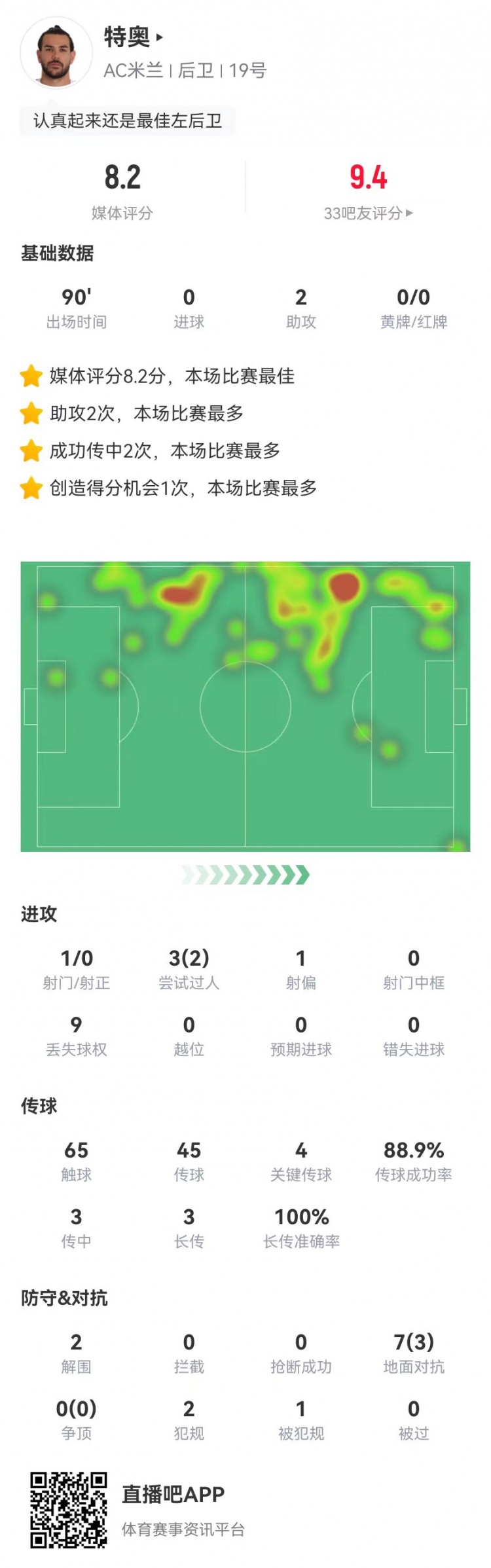 2月6日訊 米蘭在本輪意大利杯3-1擊敗羅馬,特奧本場(chǎng)數(shù)據(jù)如下: