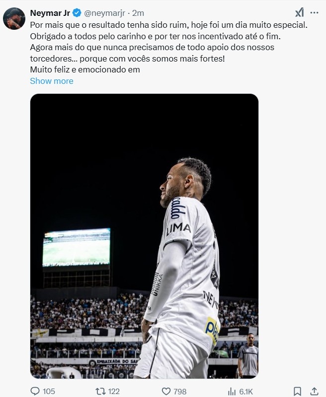 2月6日訊 圣保羅州聯賽,桑托斯1-1博塔弗戈SP。本場比賽,內馬爾替補出場,上演了回歸桑托斯的首秀,賽后內馬爾更新了社媒。