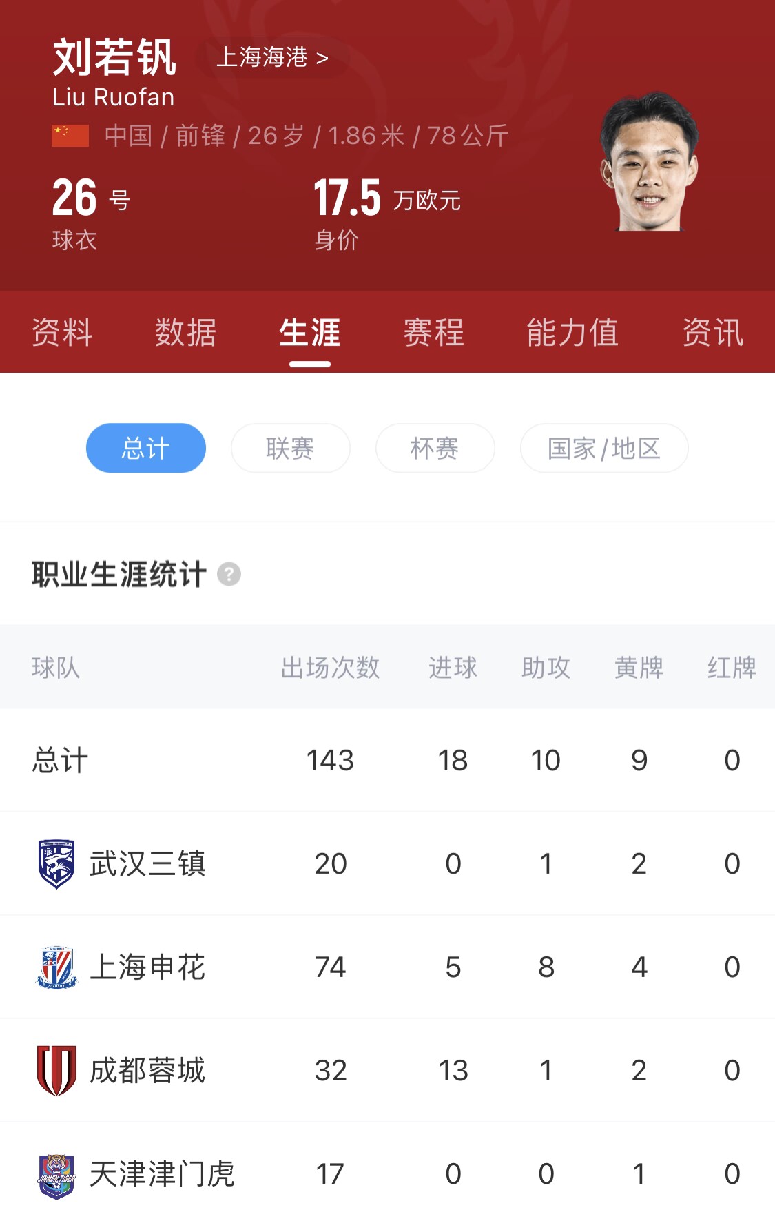 現年26歲的劉若釩,司職中鋒、邊鋒、邊前衛,出身根寶基地轉投上海申花后,2017年完成首秀。