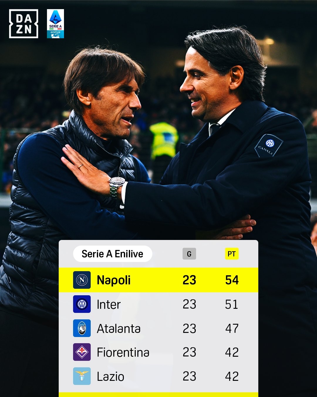 本賽季的意甲打完23輪,爭冠形勢漸漸清晰:孔蒂帶隊的那不勒斯,與衛冕冠軍小因扎吉的國米是最被看好的兩隊。此前一度排在榜首的亞特蘭大近期6輪僅1勝,后勁不足漸漸掉隊。