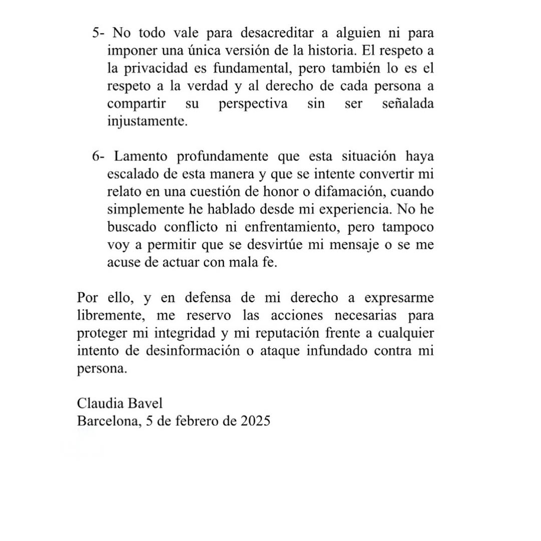 克勞迪婭-巴維爾隨后也給出了自己的回應,她表示:“鑒于最近的事件和公開聲明,我覺得有必要表達以下觀點。和任何人一樣,我有權分享我的經(jīng)歷,而不意味著侵犯他人的隱私。我一直對我的社區(qū)和關注我的人保持透明,從未試圖用我的言辭傷害任何人。”