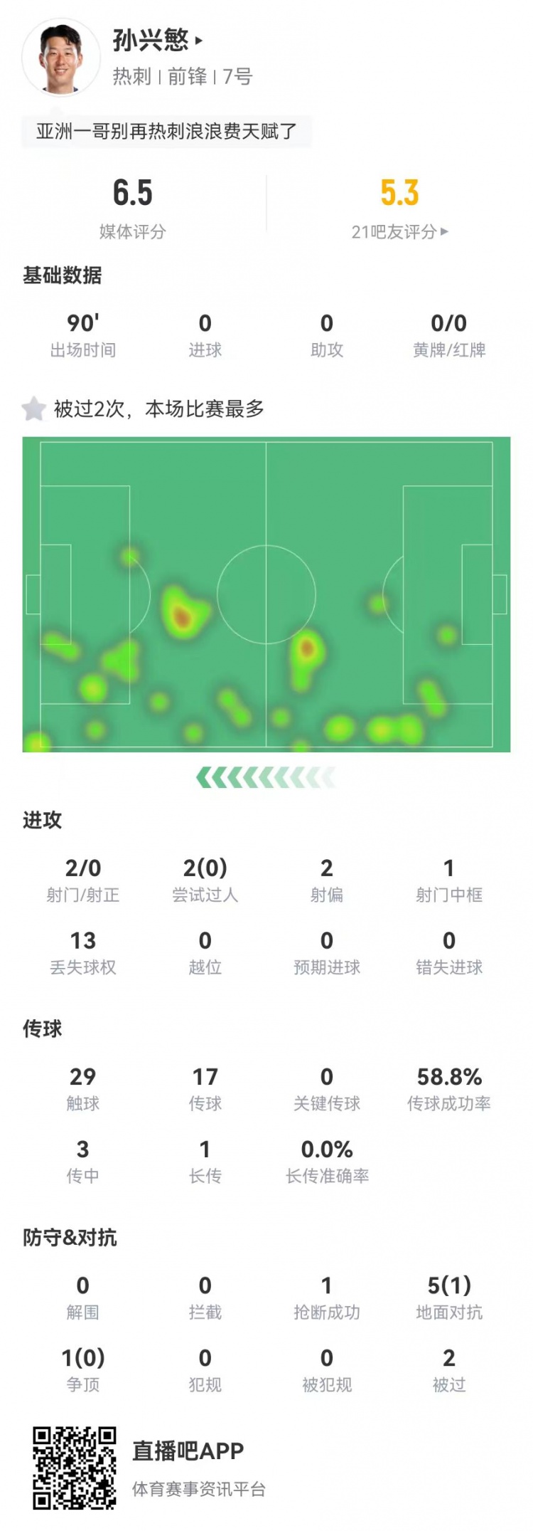 2月7日訊 熱刺在本輪聯(lián)賽杯被利物浦4-0擊敗,孫興慜本場數(shù)據(jù)如下:首發(fā)踢滿全場2射門、0射正2過人、0成功1中框29觸球17傳球、10成功,成功率59%3傳中、0成功1長傳、0成功6對抗、1成功13丟失球權(quán)1搶斷2被過獲評6.5分 本文標(biāo)簽: 足球 英超 利物浦 熱刺