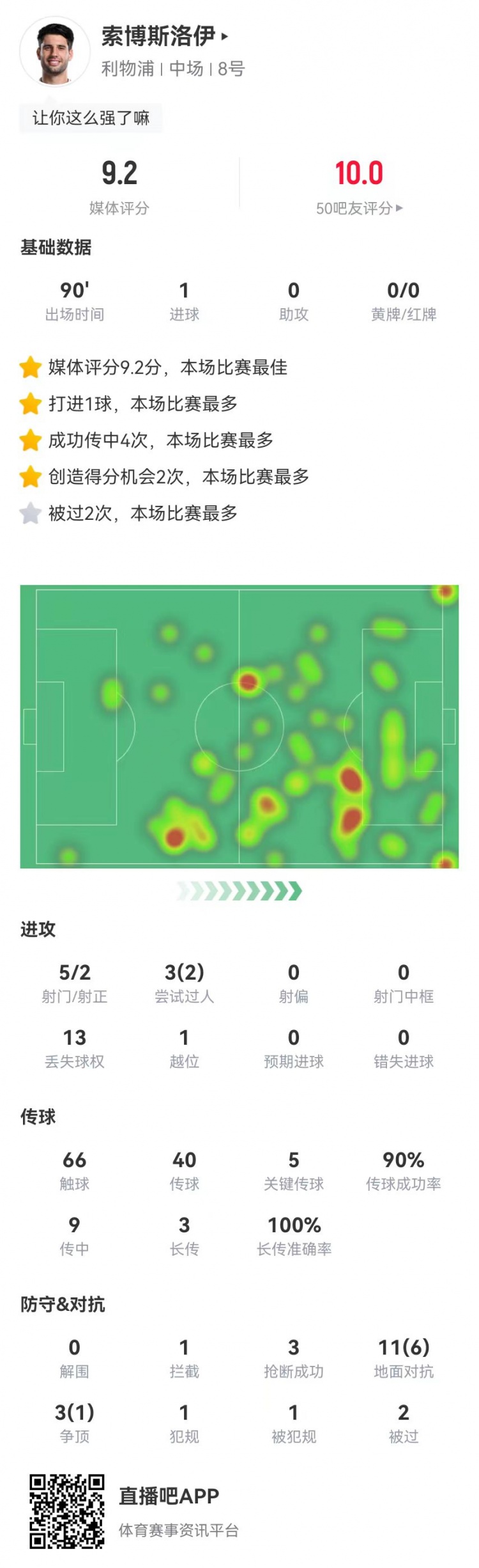 2月7日訊 利物浦在本輪聯(lián)賽杯4-0擊敗熱刺,索博斯洛伊本場數(shù)據(jù)如下:首發(fā)踢滿全場1球66觸球40傳球、36成功,成功率90%5關(guān)鍵傳球9傳中、4成功3長傳、3成功2創(chuàng)造重大機會5射門、2射正3過人、2成功14對抗、7成功13丟失球權(quán)1犯規(guī)1造犯規(guī)1越位1攔截3搶斷2被過獲評9.2分全場最高 本文標(biāo)簽: 足球 英超 利物浦 熱刺
