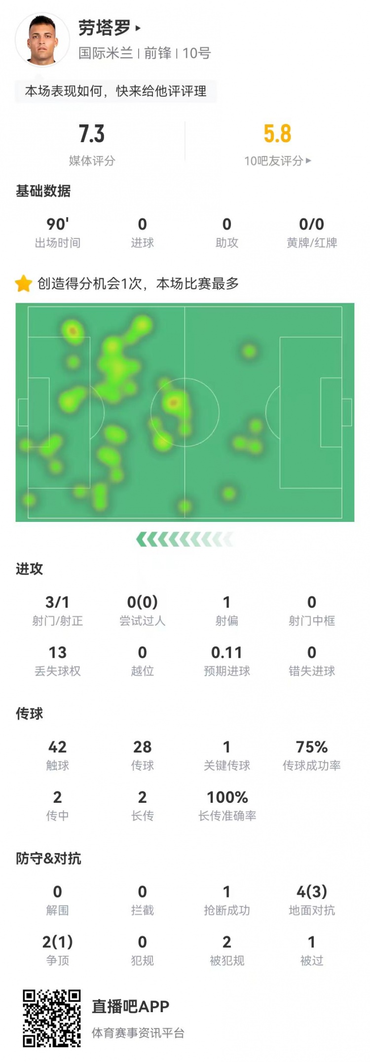 2月7日訊 國米在本輪意甲補賽0-3不敵佛羅倫薩,勞塔羅本場數據如下:首發踢滿全場3射門、1射正42觸球28傳球、21成功,成功率75%1關鍵傳球2傳中、0成功2長傳、2成功1創造重大機會6對抗、4成功13丟失球權2造犯規1搶斷獲評7.3分 本文標簽: 足球 意甲 國際米蘭 佛羅倫薩